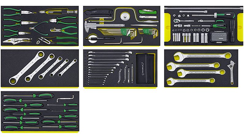 Все инструменты четко расположены и легко доступны в ложементах TCS. Вырезы для инструментов, выполненные с высокой точностью, обозначены сигнальным желтым цветом. Это позволяет с первого взгляда определить, отсутствует ли какой-либо инструмент. Таким образом, проверку комплектности можно провести очень быстро. А чтобы вы всегда брали в руки комбинированный ключ нужного размера, вырезы для инструментов были обозначены соответствующим образом.