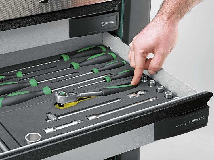 В ложементах TOOL CONTROL SYSTEM для инструментов предусмотрены устойчивые к химикатам очень точно вырезанные объемные ячейки.